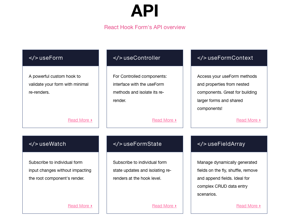 useForm , useController , useFormContext , useWatch , useFormState, useFieldArray 총 6개가 있습니다. (V7 기준)